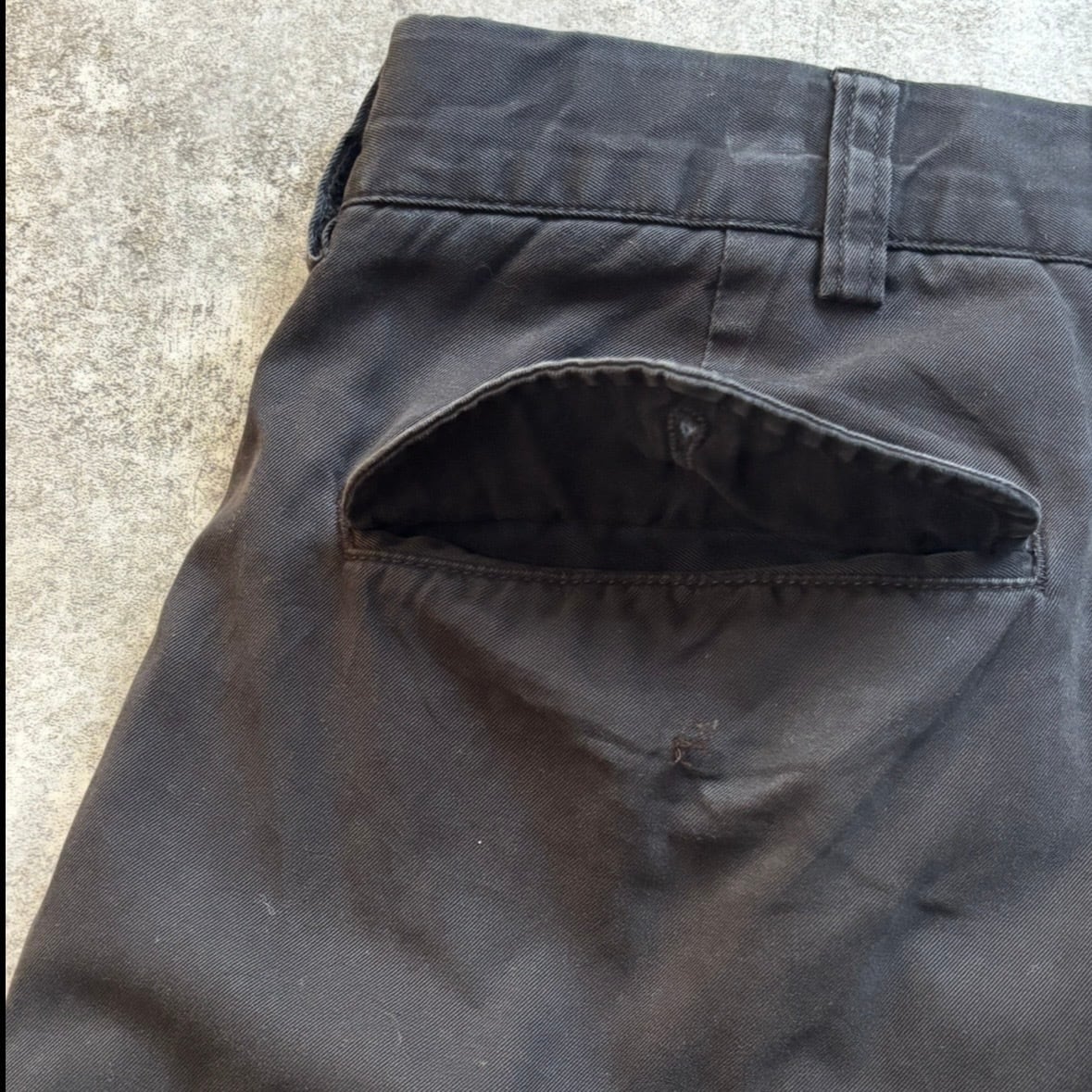 状態特記:背面ポケットボタン右破損。左欠損。裾ダブル。裾キズ。